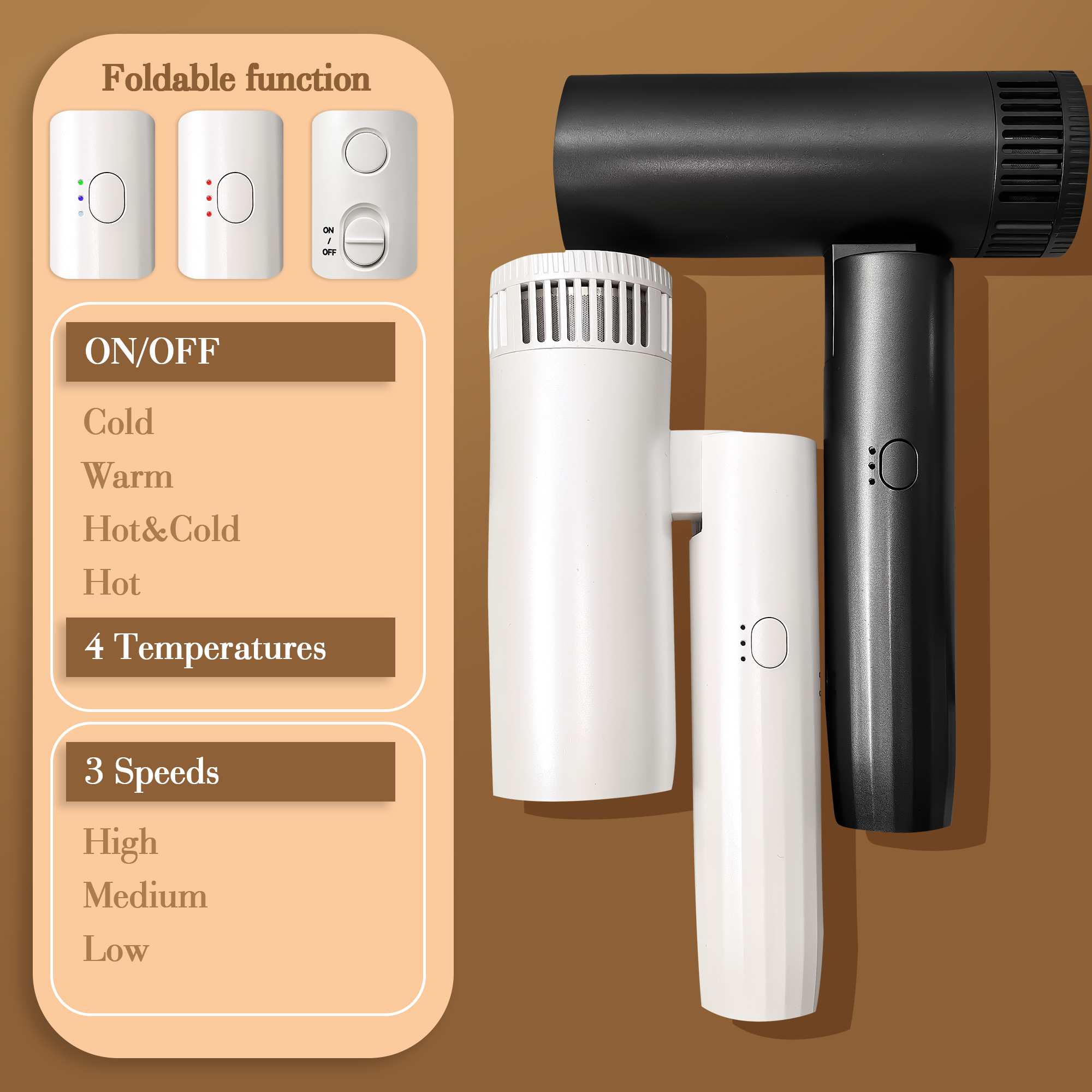 The unique foldable handle design makes the dryer more compact, easily fitting into suitcases, backpacks, or toiletry bags. Ideal for home use, campus life, or travel – maintain your best look anytime, anywhere.